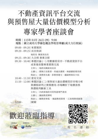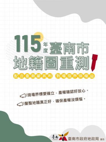 115年度地籍圖重測準備作業開始了,為使重測區內土地所有權人充分瞭解作業內容與權益事項,臺南市政府地政局自114年12月1日起將陸續舉辦15場「115年度臺南市地籍圖重測作業宣導會」,歡迎民眾踴躍參加 ...更多