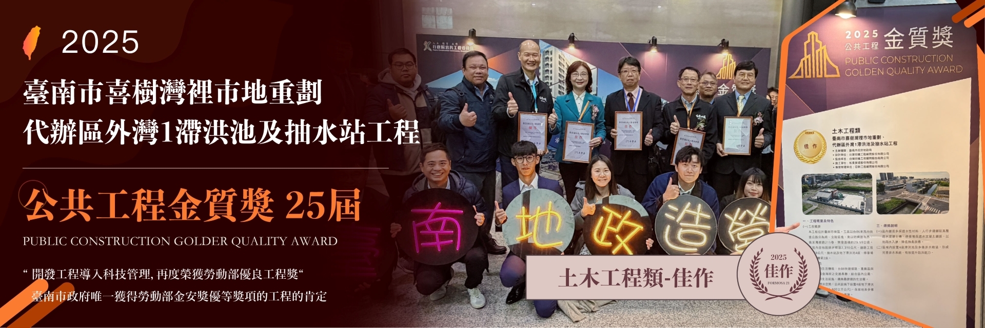 由臺南市政府地政局辦理的「臺南市喜樹灣裡市地重劃、代辦區外灣1滯洪池及抽水站工程」,於115年1月21日由行政院公共工程委員會頒發第25屆公共工程金質獎「公共工程品質優良獎」佳作獎座及獎狀,並由地政局 ...更多