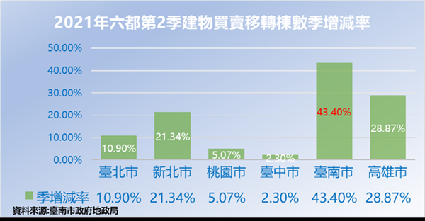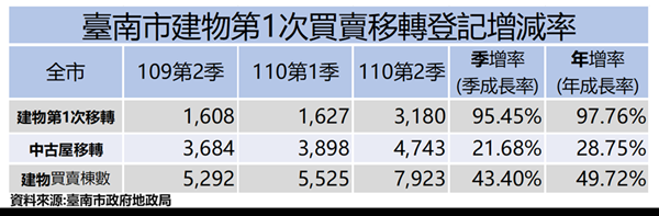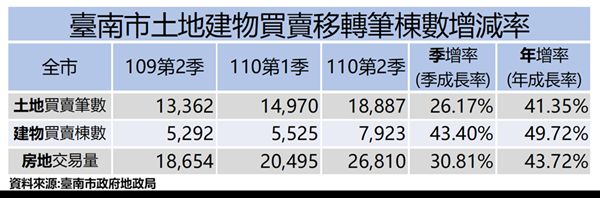 臺南市110年第2季不動產交易統計出爐,本季土地移轉18,887筆,建物買賣移轉7,923棟,與前一季(110年1至3月)相較,土地交易筆數增加3,917筆,增幅為26.17%;建物交易棟數增加2398棟,增幅為43.40%。而與去年第2季土地移轉13,362筆、建物移轉5,292棟相較,土地買賣移轉筆數年增41.35%,建物買賣移轉棟數年增49.72%。另本季建物第一次移轉3,180棟,與前一季(110年1至3月)相較,棟數增加1,553棟,增幅為95.45%,使整體交易量呈現明顯增漲。