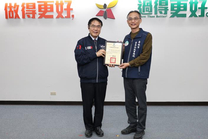市長黃偉哲今(30)日下午主持市政會議,接受地政局呈獻榮獲「內政部114年地政業務督導考核單項業務優良」及「第30屆地政貢獻獎」兩項殊榮,並親自頒發內政部「114年度內政業務志願服務銅質獎」予臺南地政事務所志工張賜三先生。黃市長肯定地政局在業務督導考評、志工服務推動及個人專業貢獻等面向皆表現亮眼,充分展現臺南地政團隊的整體專業實力與行政效率,為市政推動再添佳績。