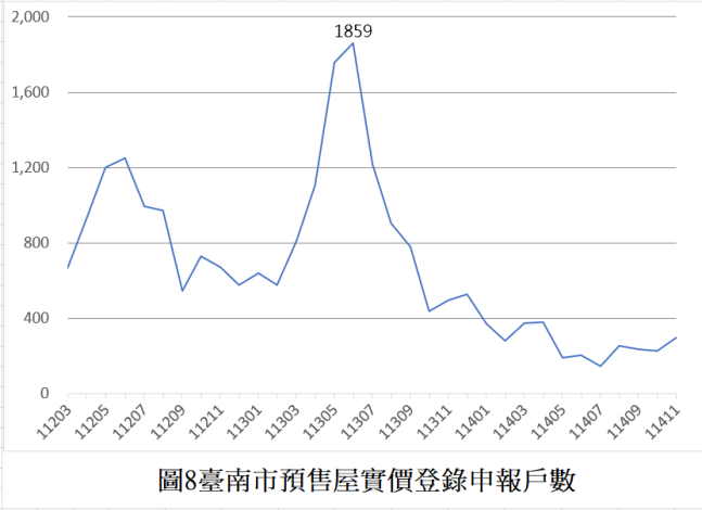 進一步觀察各行政區交易量表現,交易量前三名分別為安南區(309棟)、永康區(219棟)以及安平區(173棟)。與去年同期相比,安平區、仁德區、永康區以及中西區增幅較為顯著,本期交易量分別增加37.30%、16.00%、15.26%、14.29%,其中永康區因區內新建案陸續完工後,第一次移轉登記的案量較去年同期增幅134.69%。相比之下,東區、北區以及佳里區交易量皆較去年同期下跌逾5成。再觀察預售屋實價登錄申報件數113年7月起已呈現逐步下修量縮態勢,本期與去年同期(113年11月)相比下降40%,顯示在信用管制影響下,市場整體交易量能續顯審慎,後續交易動能有待觀察。