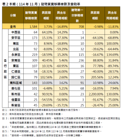 地政局局長陳淑美表示,114年11月國內經濟景氣信號分數為37分,較上月增加2分,燈號續呈黃紅燈。領先指標持續上升,同時指標轉呈上升,顯示國內經濟穩健成長。本期住宅價格指數反映,多數行政區房價仍處高檔緩步修正階段。交易量方面,全市11月建物移轉棟數共1,584棟,較前期(10月)微幅增加3.73%,整體買賣棟數與去年同期(113年11月)相較則減少16.89%,觀察結果顯示,本期交易量雖較上月微幅回升,但較去年同期仍有顯著落差,反映市場仍處觀望氛圍。