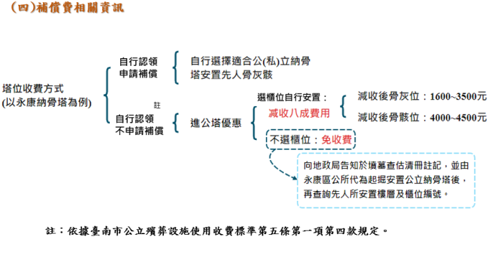 依據臺南市公立殯葬設施使用收費標準第五條規定,因本市公墓更新、開關公共建設或配合公共設施景觀,自行起掘之骨灰(骸) ,且未領取遷葬補償費或救濟金,申請使用本市公立殯葬設施可減收八成費用。