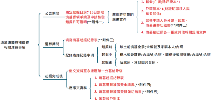1. 本府辦理墳墓補償金及家屬自行遷葬公告後,請家屬於自行遷葬前先至永康區第一公墓納骨塔(臺南市永康區忠孝路250號,聯絡電話:06-2012817)辦理墳墓認領手續及申請核發起掘許可證明。