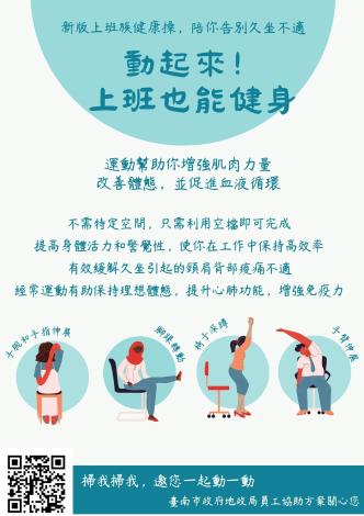 上班族常久坐、運動量不足,易引發身體不適,國健署推新版「上班族健康操」,支持全齡健康體位、職場健康促進全長15分鐘,結合暖身 + 主要運動 + 靜態收操,每日建議上午、下午各做一次,累積30分鐘活動量不需特定空間,利用空檔即可運動,促進活力、減少痠痛、提升整體健康掃我掃我,邀您一起動一動臺南市政府地政局員工協助方案關心您
