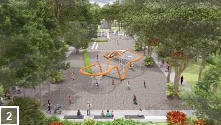 園區的「二期公園(含綠園道)」總面積約15.81公頃,相當於一座臺南公園。北側公園設計上特別保留原有老樹、防流彈土堤及砲校遺構,並將軍事意象融入現代遊具造型,透過砲台、迷彩等設計語彙轉化為兒童遊戲空間,讓歷史記憶以生活化的方式延續。南側則保留砲校大門、六角崗哨與「親愛精誠」照壁,未來將規劃為市集與活動廣場,成為市民休憩與文化交流的新據點。