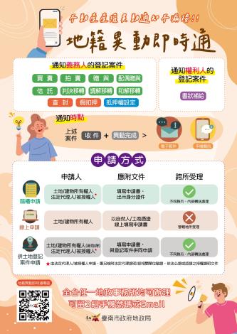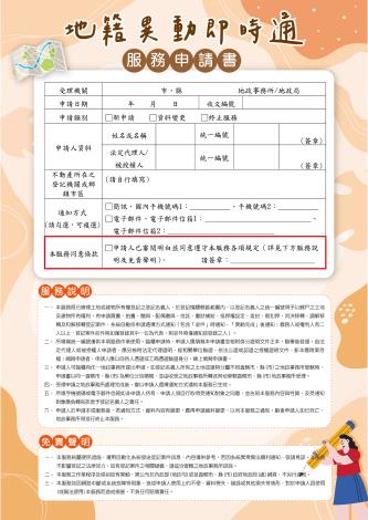 「地籍異動即時通」服務,經申請後,所有權人名下不動產如遇有向地政事務所申請特定登記原因案件,在「收件」以 及「異動完
